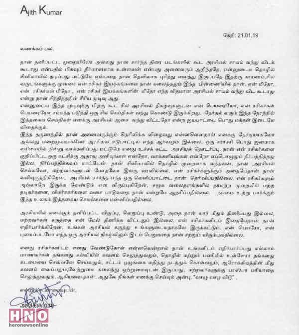 என்னுடைய இந்த முடிவுக்குப் பிறகுகூட சில அரசியல் நிகழ்வுகளுடன் என் பெயரையோ, என் ரசிகர்களின் பெயரையோ சம்மந்தப்படுத்தி ஒரு சில செய்திகள் வந்துகொண்டு இருக்கிறது. தேர்தல் வரும் இந்த நேரத்தில் இத்தகைய செய்திகள் எனக்கு அரசியல் ஆசை வந்துவிட்டதோ என்கிற ஐயப்பாட்டை பொதுமக்களிடையே விதைக்கும். என் ரசிகர்களிடம் எனது வேண்டுகோள் என்னவென்றால் நான் உங்களிடம் எதிர்பார்ப்பது எல்லாம் மாணவர்கள் தங்களது கல்வியில் கவனம் செலுத்துவதும், தொழில் மற்றும் பணியில் உள்ளோர் தங்களது கடமையை செவ்வனே செய்வதும். சட்டம் ஒழுங்கை மதித்து நடந்துக் கொள்வதும், ஆரோக்கியத்தின் மீது கவனம் செலுத்துவதும், வேற்றுமை கலைந்து ஒற்றுமையுடன் இருப்பதும் மற்றவர்களுக்கு பரஸ்பர மரியாதை செலுத்துவதும், ஆகியவை தான். அதுவே நீங்கள் எனக்கு செய்யும் அன்பு. வாழு வாழ விடு” என்பன உள்ளிட்ட பல கருத்துகலை அஜித் தனது அறிக்கையில் தெரிவித்துள்ளார்.