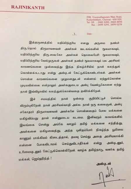 “நண்பர் தொல். திருமாவளவன் ஊடகங்களின் மூலமாகவும், வைகோ தொலைபேசி மூலமாகவும், வேல்முருகன் நண்பர் மூலமாகவும் பல அரசியல் காரணங்களை முன்வைத்து இந்த (யாழ்ப்பாணம்) நிகழ்ச்சியில் நான் கலந்துக்கொள்ளக் கூடாது என்று அன்புடன் கேட்டுக் கொண்டார்கள். அவர்கள் சொன்ன காரணங்களை முழுமனதுடன் என்னால் ஏற்றுக்கொள்ள முடியவில்லை என்றாலும், அவர்களுடைய அன்பு வேண்டுகோளை ஏற்று நான் இவ்விழாவில் கலந்து கொள்வதை தவிர்க்கிறேன்” என்று நடிகர் ரஜினிகாந்த் அறிவித்துள்ளார்.