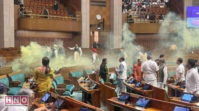 மக்களவைக்குள் புகுந்து “அராஜகம் ஒழிக” என்ற முழக்கத்துடன் வண்ணப்புகை குப்பிகள் வீச்சு: 4 பேர் கைது!
